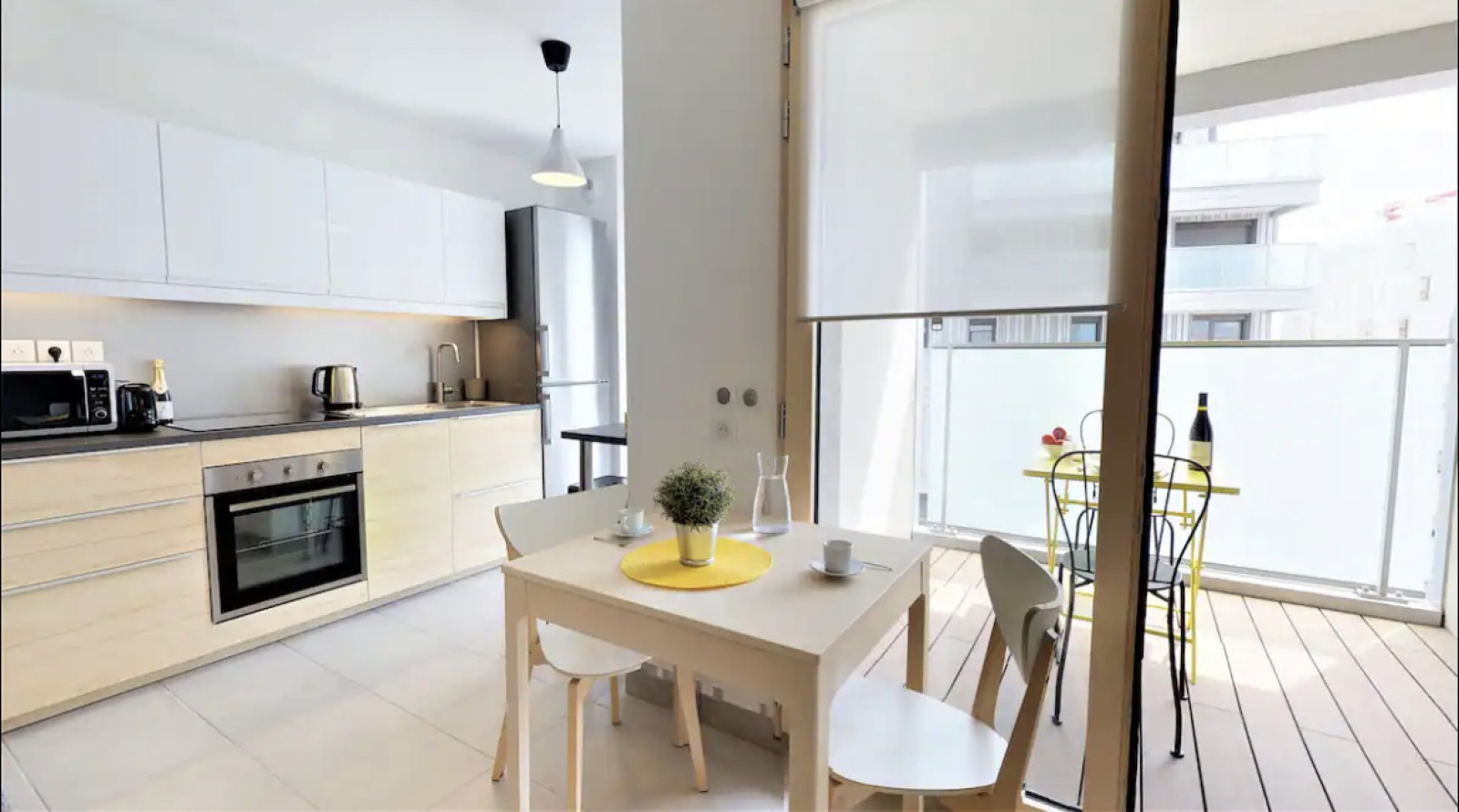 Cuisine équipée avec four, four à micro-onde, frigidaire et congélateur, plaque de cuisson vitrocéramique, machine à café, bouilloire, grille pain