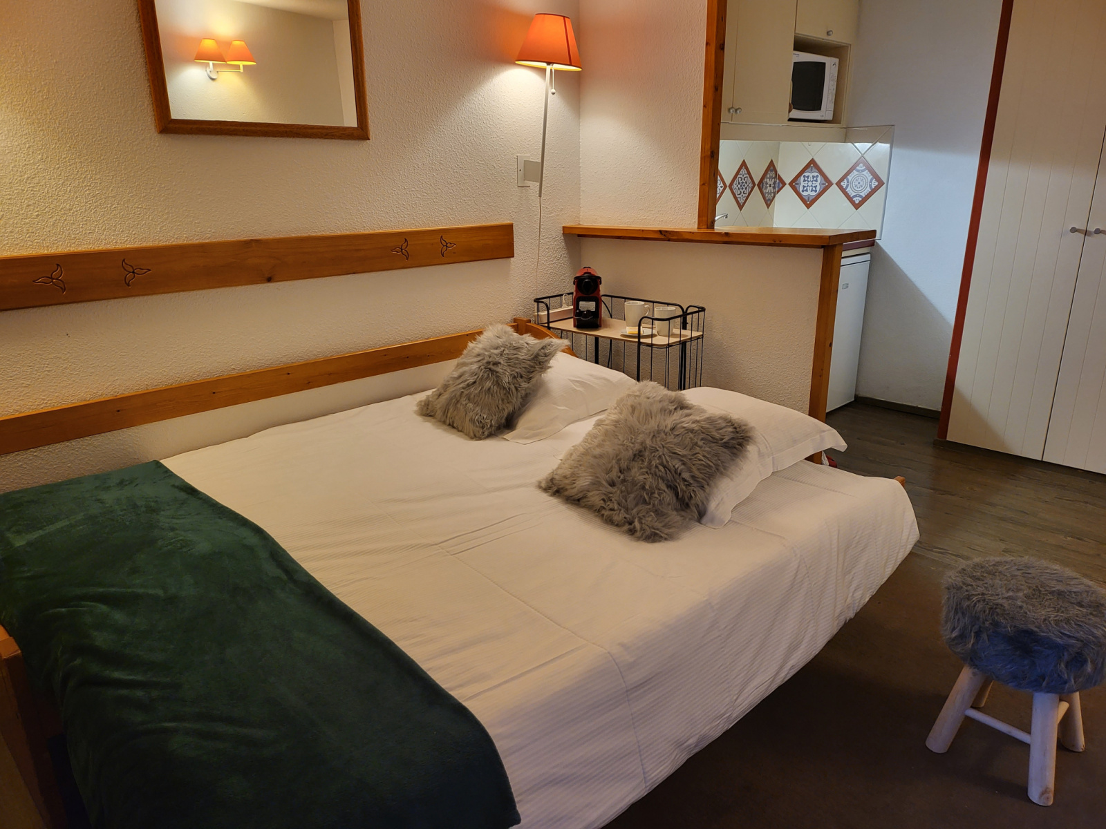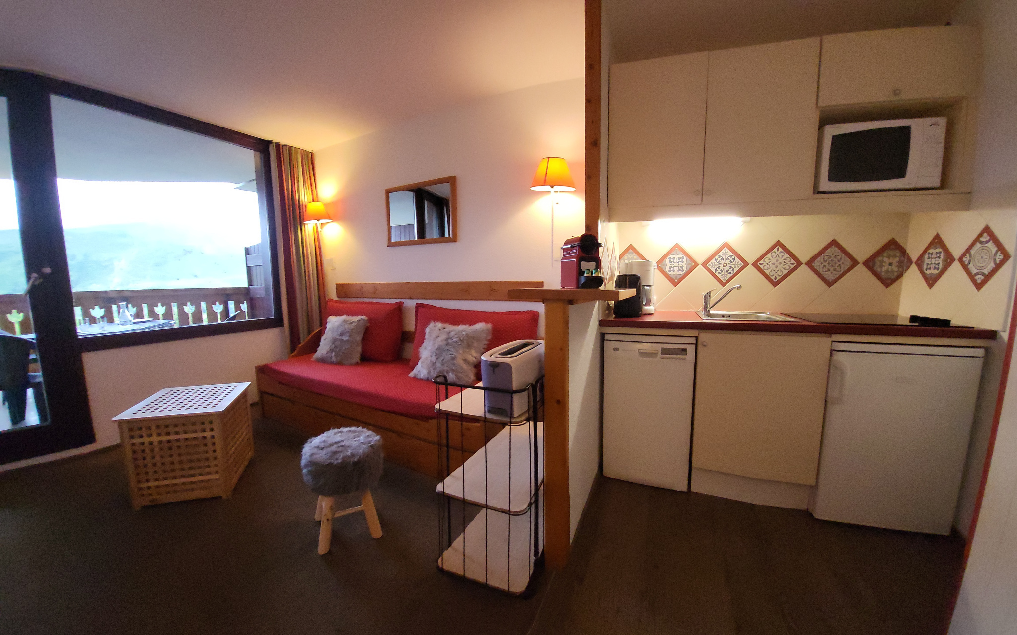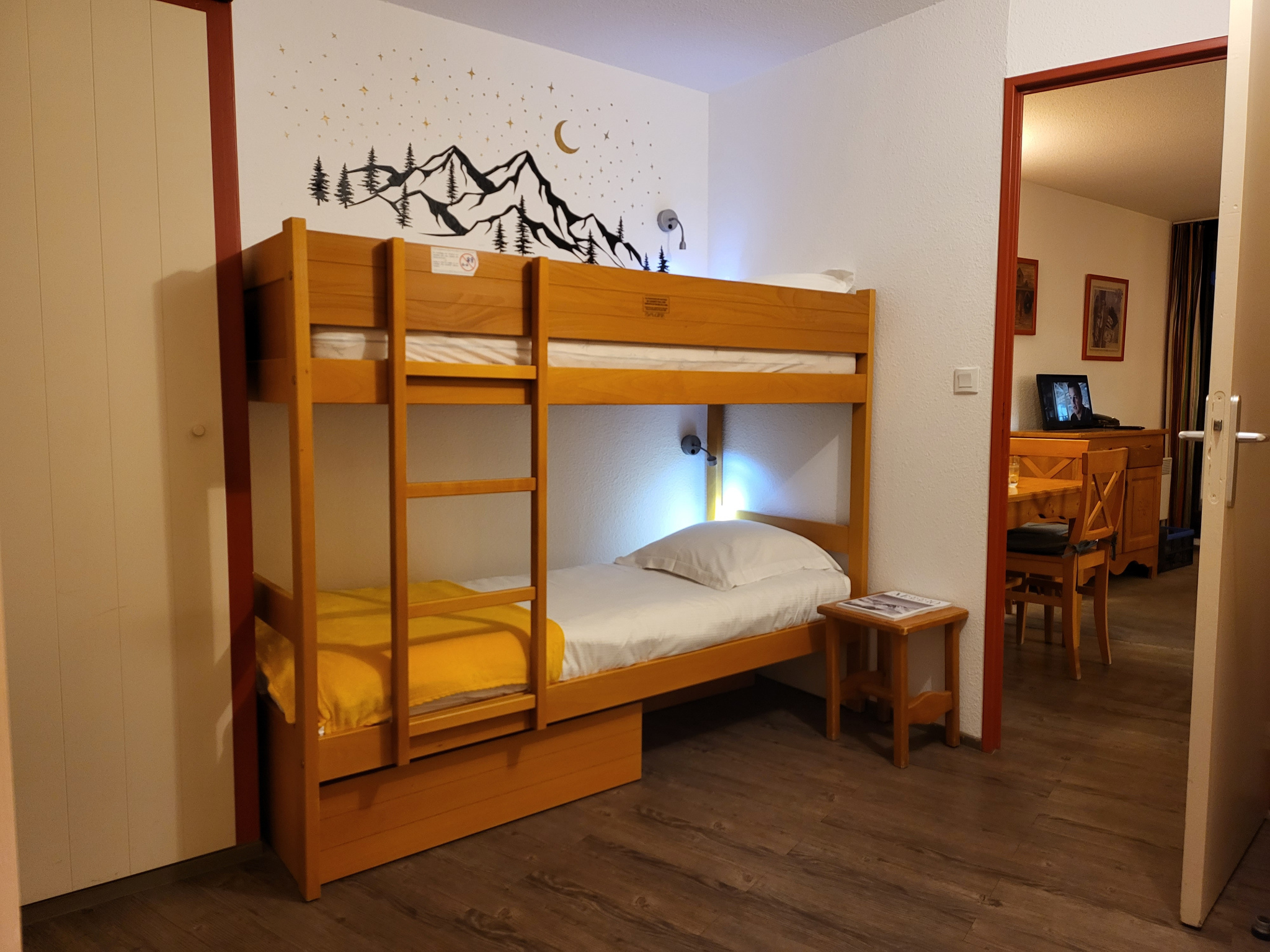 Proximité immédiate du Club Méd. Une chambre fermée double couchage, un coin montagne avec lits à étage, une pièce à vivre avec kitchenette et canapé lit pour un couchage de qualité.