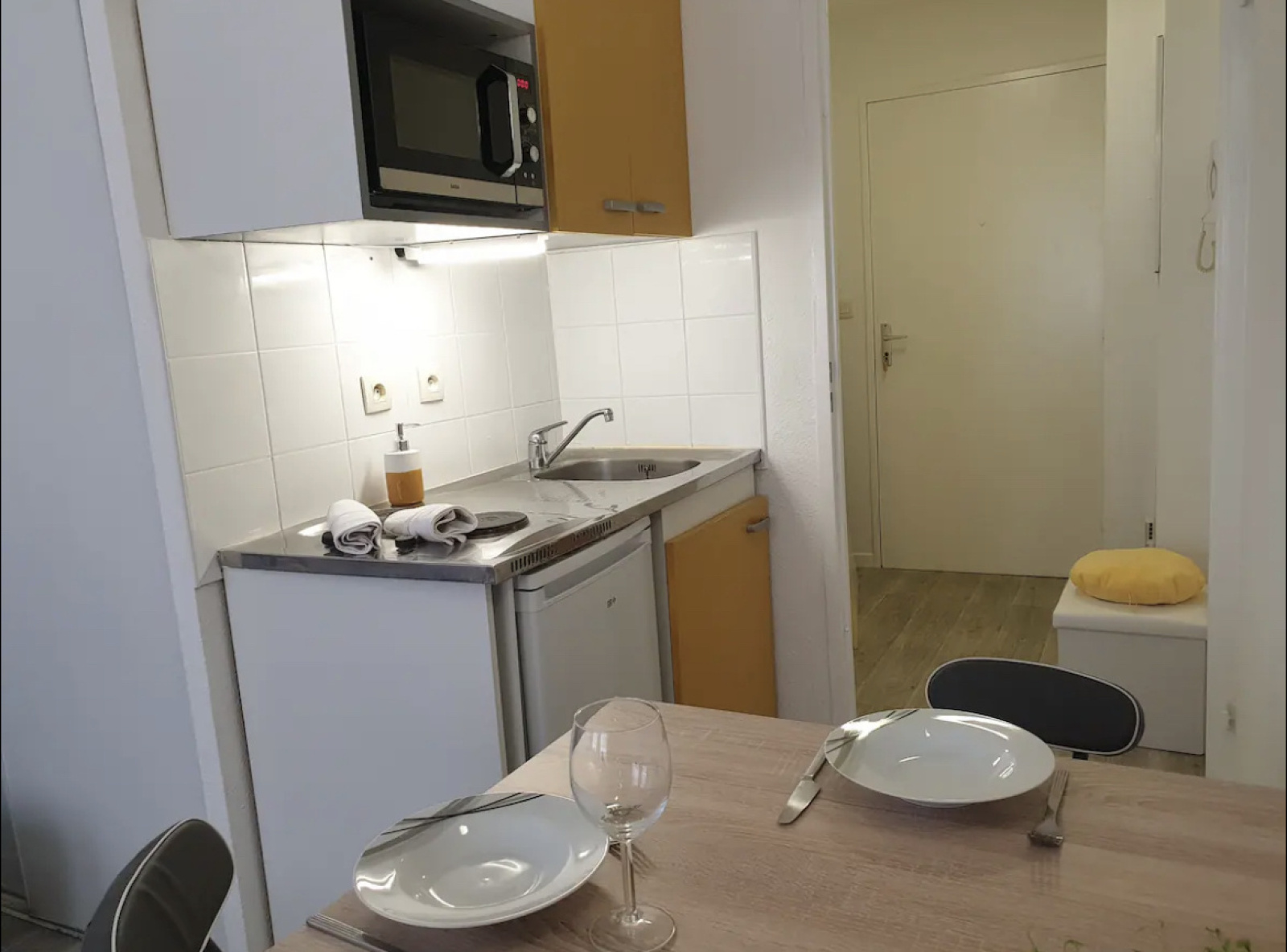 Cuisine équipée avec four à micro-onde, frigidaire, plaque de cuisson, machine à café, bouilloire.